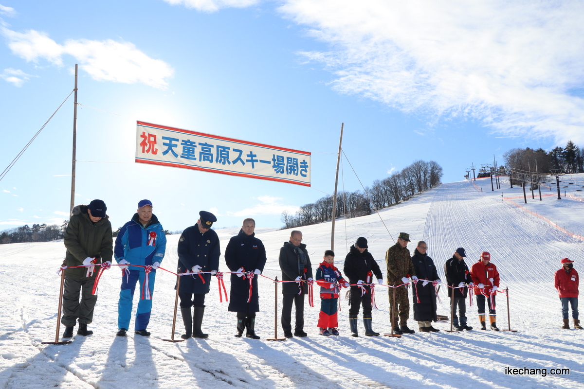 天童高原スキー場の安全祈願祭・スキー場開きが、午前9時から開催されました。この日は年に一度のリフト無料開放の日で、初滑りを楽しもうと、市内外からの来客だけでなく外国人観光客の姿もありました。雪はまだ少な目で、ところどころ草が見えるところもありましたが、前日に続いての青空で、わたしも初滑りを堪能してきました。