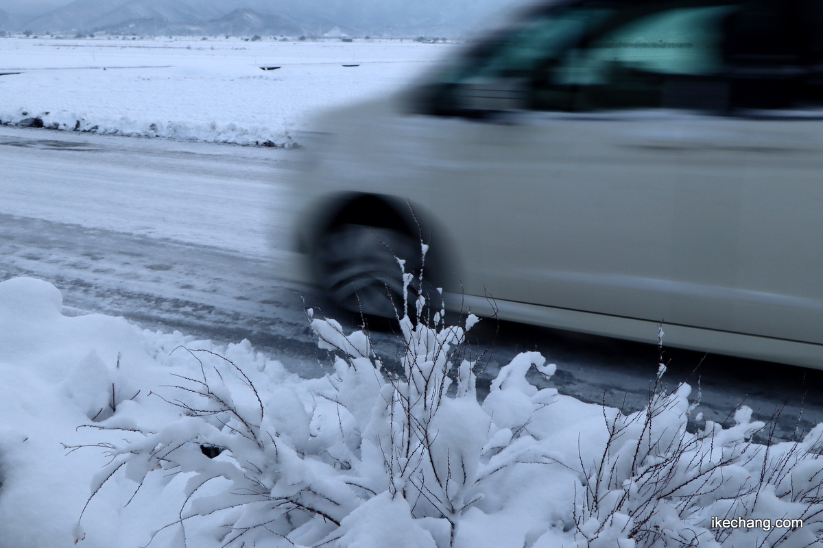 天童市では昨日から久しぶりにまとまった雪が降り、けさの積雪は7センチになりました。午前7時時点の気温はマイナス5度で、道路は圧雪凍結のツルツル雪道です。空には雲が広がってますが、切れ間から青空が見ます。