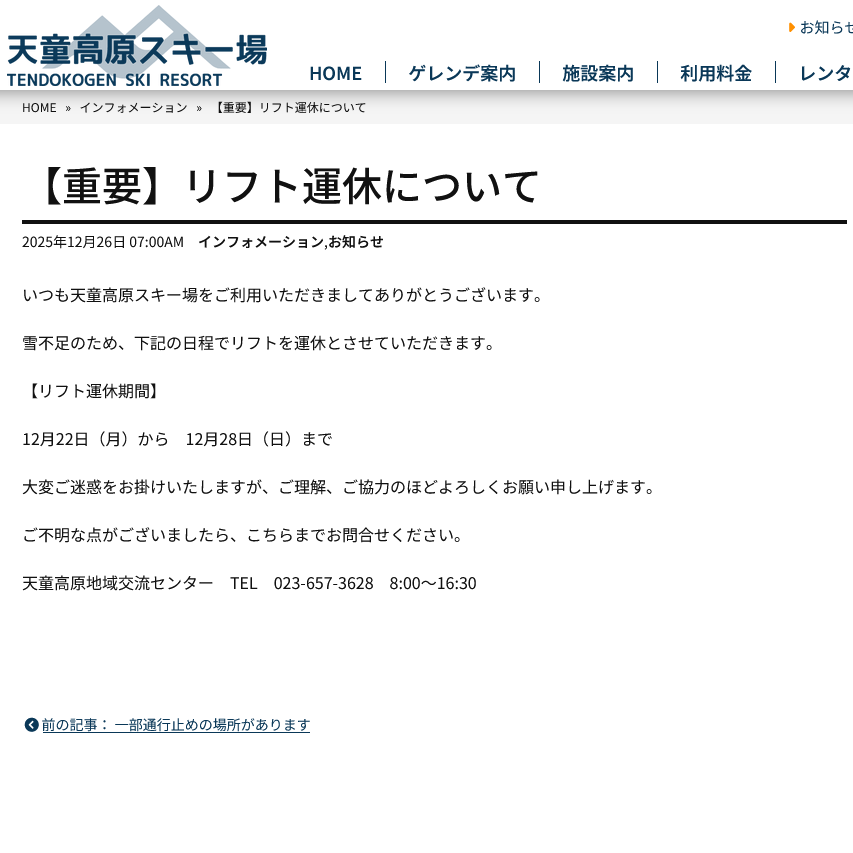 一昨日までの季節外れの高温で天童高原スキー場は雪が足りなくなり、当初12月22日(月)から26日(金)までだったリフトの運休期間が、28日(日)まで延期されてしまいました。今後は晴れが続く予報になっていて、気温は低くなるのですが、肝心の雪がどれぐらい振るのか…と懸念されます。