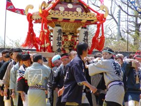 おまつりの雰囲気を盛り上げようと、本神輿(ほんみこし)の渡御(とぎょ)がおこなわれました。しかしながら、神輿は1基だけ、担ぎ手は各神輿団体の代表ということで、なんとなく中途半端な印象です。どうせやるんであればもう少し派手にやったほうがいいのでは、と思ってしまいました。それとも、神輿パレードがある「天童夏まつり」のPRという意味合いが強いのでしょうか? |