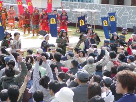 今年は新たに「もちまき」がおこなわれました。左の写真が1日目の様子、右の写真が2日目の様子です。1日目はなんとか混乱せずに済みましたが、はたから見ていて将棋倒しが起きるんじゃないかとかなり危険を感じました。主催者側もそう思ったのか、2日目にはトラロープ(黄色と黒色の縞模様のロープ)で囲い、もちまきをする側とある程度の距離が取られるようにしてました。