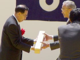 式典の最後には贈答品の交換があり、天童市から多賀城市には特産品で縁起物でもある左馬(ひだりうま)の置き駒が、宮城県多賀城市から天童市には多賀城碑(たがじょうひ)の拓本が贈呈されました。 |