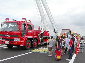 山形中央ICでは、工事車両や除雪車、消防車の展示がおこなわれていました。消防車や工事車両の一部は体験試乗もできたため、小さな子ども連れの家族が長い行列を作っていました。 (写真は、梯子車に並んだ人たちの様子です)