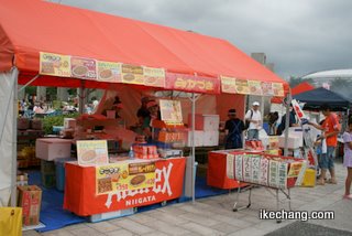 午後1時過ぎ、スタジアムに着いてきょろきょろしていると「ごくろうさまです〜。おせっかいかもしれないけど、一度入ると外に出られないから、いちおう屋台もあるんで、今のうちに行くことをオススメしますよ〜。でも、山形さんにはかなわないけどね〜(笑)よかったらどうぞ〜」と新潟サポーターの方が声をかけてくれました。とりあえず、順番待ちの列に荷物を置いて、さっそく散策に…。