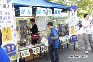 テントの軒先に「がんばろう東北」のメッセージを掲げ、山形県と宮城県のノボリ旗でアピールしたり、観光パンフレットを配布したりしていました。