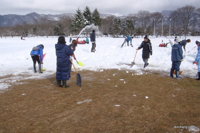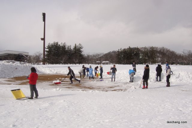 アルミやスチールのスコップを持ってきた人はその氷を砕く作業を担当し、プラスチックのスコップを持ってきた人は、その砕かれた雪をせっせせっせと運んでいく、という気の遠くなるような作業を続けました。