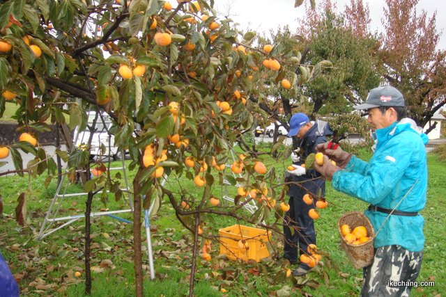 柿を収穫する藤内新田のみなさん。時おり雨が強くなるなか、午前9時からおよそ1時間で収穫を終えました。