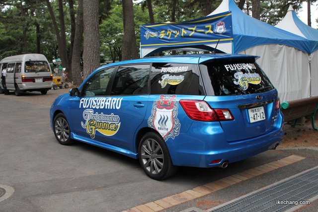 ザスパクサツ群馬のロゴが入ったスバル車。群馬県太田市にはスバルの自動車工場があります。