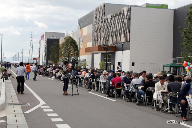 「千局盤来 将棋対局で世界記録に挑戦!」と銘打って行われたこのイベントは、天童芳賀タウン(芳賀土地区画整理事業)地内にオープンした「イオンモール天童」東側の道路を会場に開催されました。イオンモールの長さと同じおよそ400メートルの道路を通行止めにして、ここに机とイスを並べました。