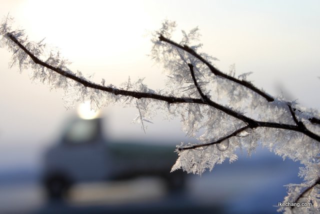 自宅の庭木に、珍しく霧氷(むひょう)ができました