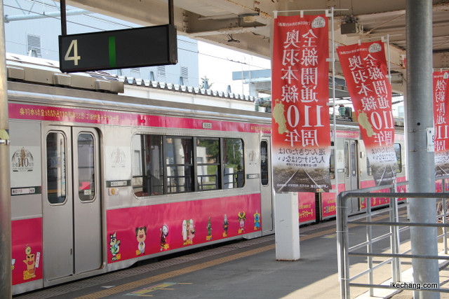 JR東日本秋田支社は奥羽線前線開通110周年記念事業の一環として、青森、秋田、山形、福島4県のゆるキャラを描いた普通電車「ご当地キャラ号」を運行している。10月末まで。
