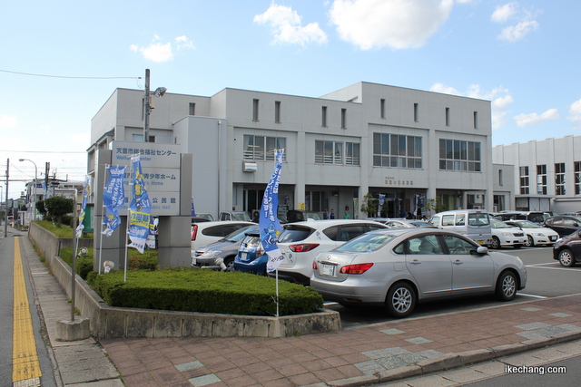 パブリックビューイング会場の天童中部公民館。周りにモンテのノボリ旗を掲げました。