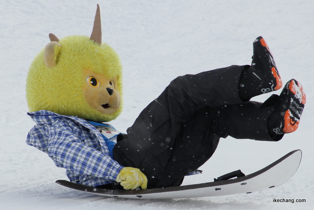 【天童高原×ディーオ(32)】スノーボードにチャレンジするディーオ(3/20)途中でのファンサービスも忘れません。