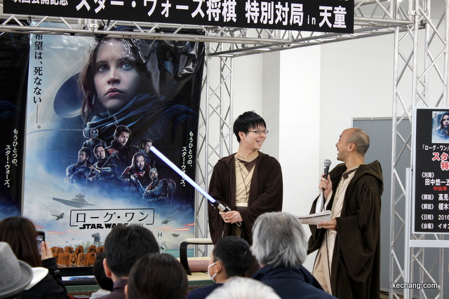 映画「ローグ・ワン/スター・ウォーズ・ストーリー」が12月16日(金)深夜から公開されるのを記念して、田中悠一(たなか ゆういち)五段と山口恵梨子(やまぐち えりこ)女流二段による「スター・ウォーズ将棋特別対局in天童」がイオンモール天童で開催されました。