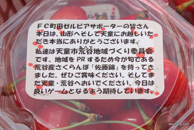 また、試合前には、スタジアム近くの天童市荒谷地区の住民でつくる荒谷地域づくり委員会(佐藤昭生委員長)が、町田サポーターに同地区産のサクランボを振る舞った。昨年に続き2回目。県外に果樹産地をPRしようと、佐藤錦100パック(1パック100グラム)を用意。メンバー7人が、特産物やお薦めスポットを掲載したパンフレットとともに、アウェー側スタンド入場口で手渡した。受け取ったサポーターは敵地での思いがけない「もてなし」に笑顔だった。
