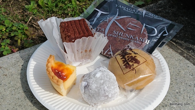右上から時計まわりに、ココアシナモンクッキー(武田)、温泉まんじゅう(盛寿庵)、塩豆大福(梅の家)、チーズタルト(ハヤシ)、生チョコプチケーキ(ボンむらやま)、