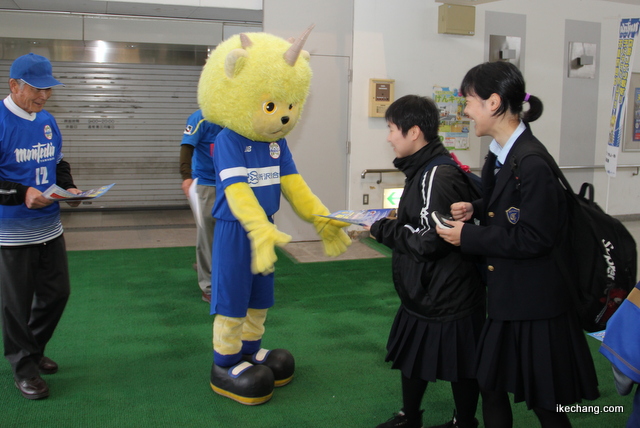 天童駅にはマスコットキャラクター「ディーオ」も登場。愛くるしいしぐさでチラシをまいたが、応援隊のボルテージにちょっと引き気味の生徒も。肌寒い雨空を吹き飛ばすように、「一緒にスタンドを埋め尽くそう」の熱い声が響いた。