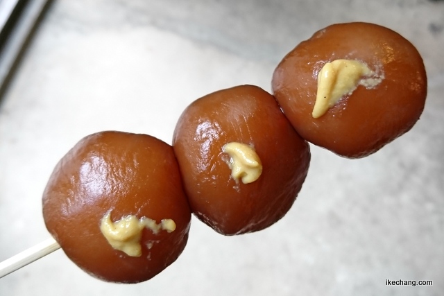 玉こんにゃくは1串100円で販売。からしはお好みで。