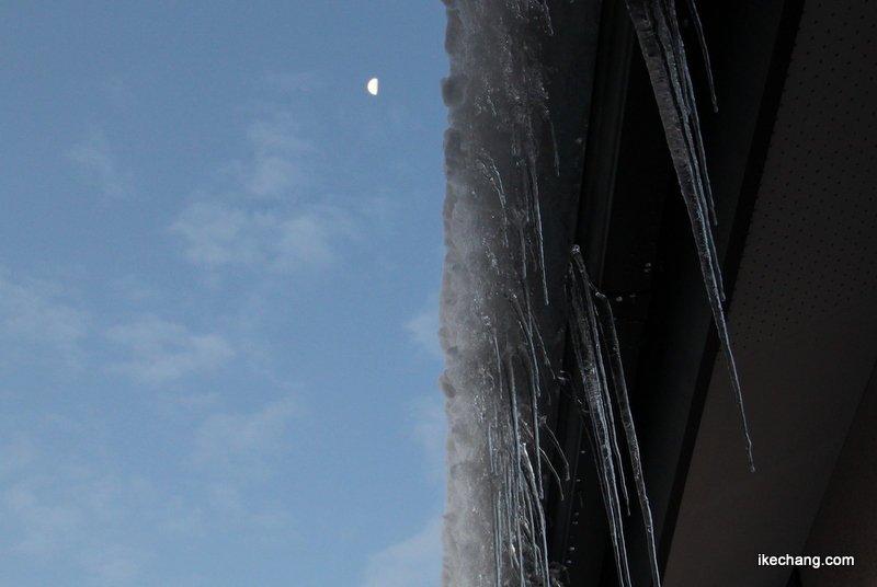 軒先のつららの向こうに半月「下弦の月」が輝いています