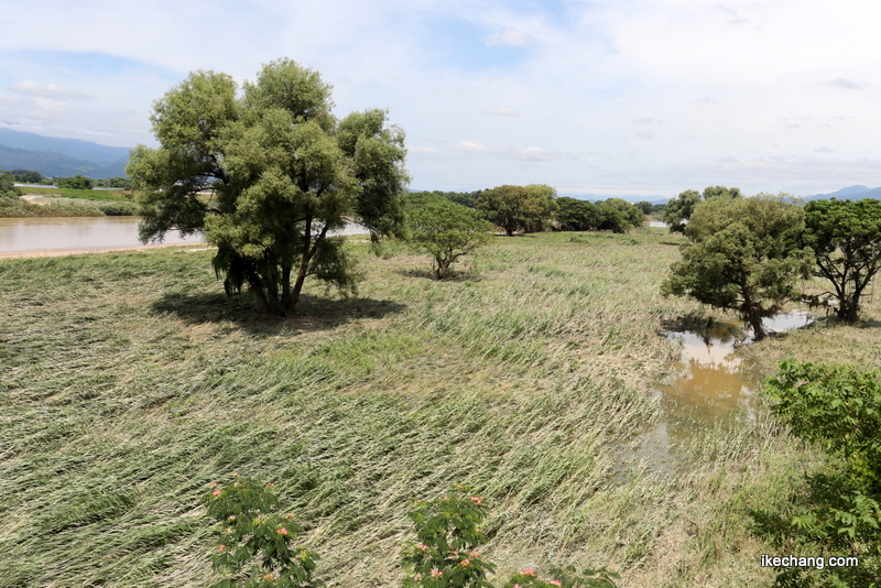 河川敷のサイクリングロードに降りると、雑草の汚れ具合で水の高さが分かります