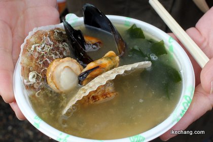活ホタテを水から入れて、よく煮込み、塩と味噌で味を調えます。ホタテのうま味が十分出たら、とろろ昆布とワカメを入れて出来上がり。