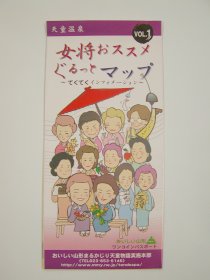 天童温泉の旅館・ホテルのうち、以下の施設に限って500円で日帰り入浴することができます。利用の際には「女将おススメぐるっとマップ」が必要となりますので、天童へお越しの際にはまずJR天童駅となり「パルテ」2階の天童市観光物産協会(天童市観光センター)へお立ち寄りになり、左の観光マップをお求めください。